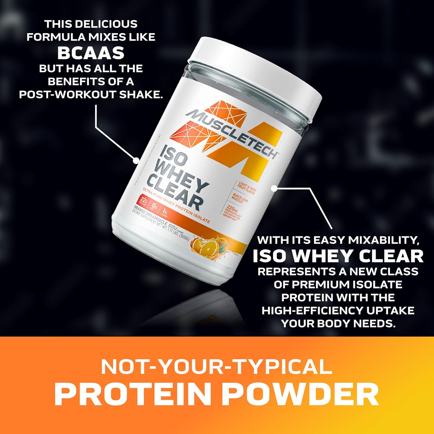 - A Lighter, Cleaner Protein Experience: MuscleTech Iso Whey Clear is a breakthrough alternative for those looking for a light, clean way to get their protein. Orange Dreamsicle flavor. 19 servings.