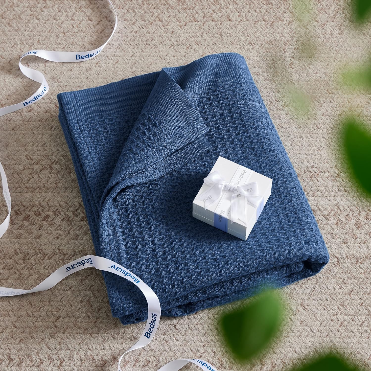 Bedsure 100% Cotton Blanket Twin XL Size for College Dorm - Breathable and Soft, Waffle Weave Twin Blanket for Summer, Dorm Room Essentials, Navy, 66x90 inches
