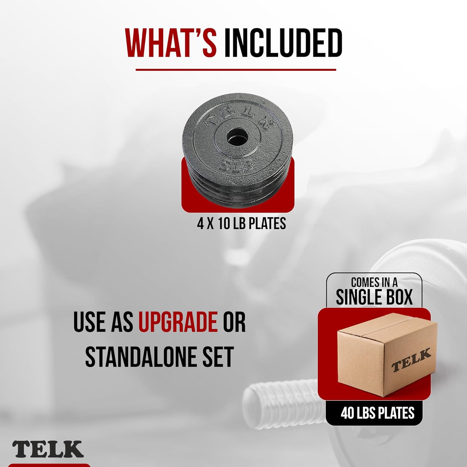 - EXPAND YOUR TELK SET – Includes (4) 10-lb plates only. Add to your existing TELK dumbbells or barbell for heavier lifts.