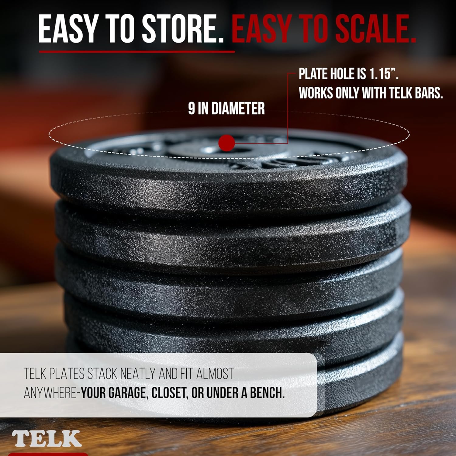 - 1.15” DIAMETER PLATES – Built to fit TELK dumbbell handles and bars. Not compatible with standard 1” systems.