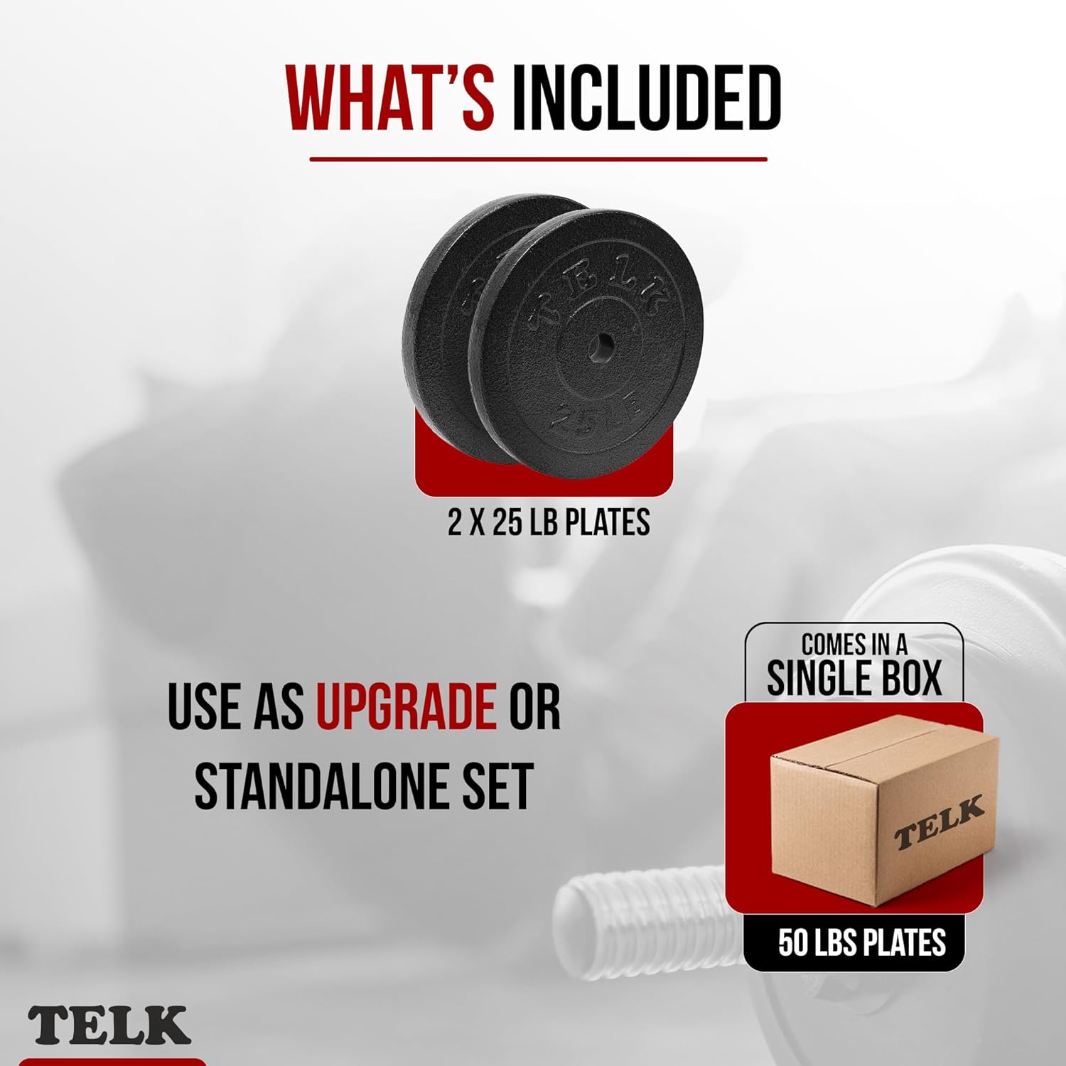 - EXPAND YOUR TELK SET – Includes (2) 25-lb plates only. Designed for easy upgrading of your current weight set.