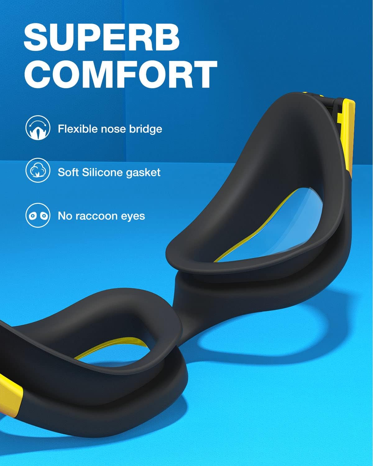 - [Comfortable Wearing] - This swimming goggles come with soft and flexible silicone gasket, adjustable split head strap, TPR ergonomic nose bridge, provides excellent suction and ensure non-slip coverage, that is designed to fit a wider range of face shapes for both women and men