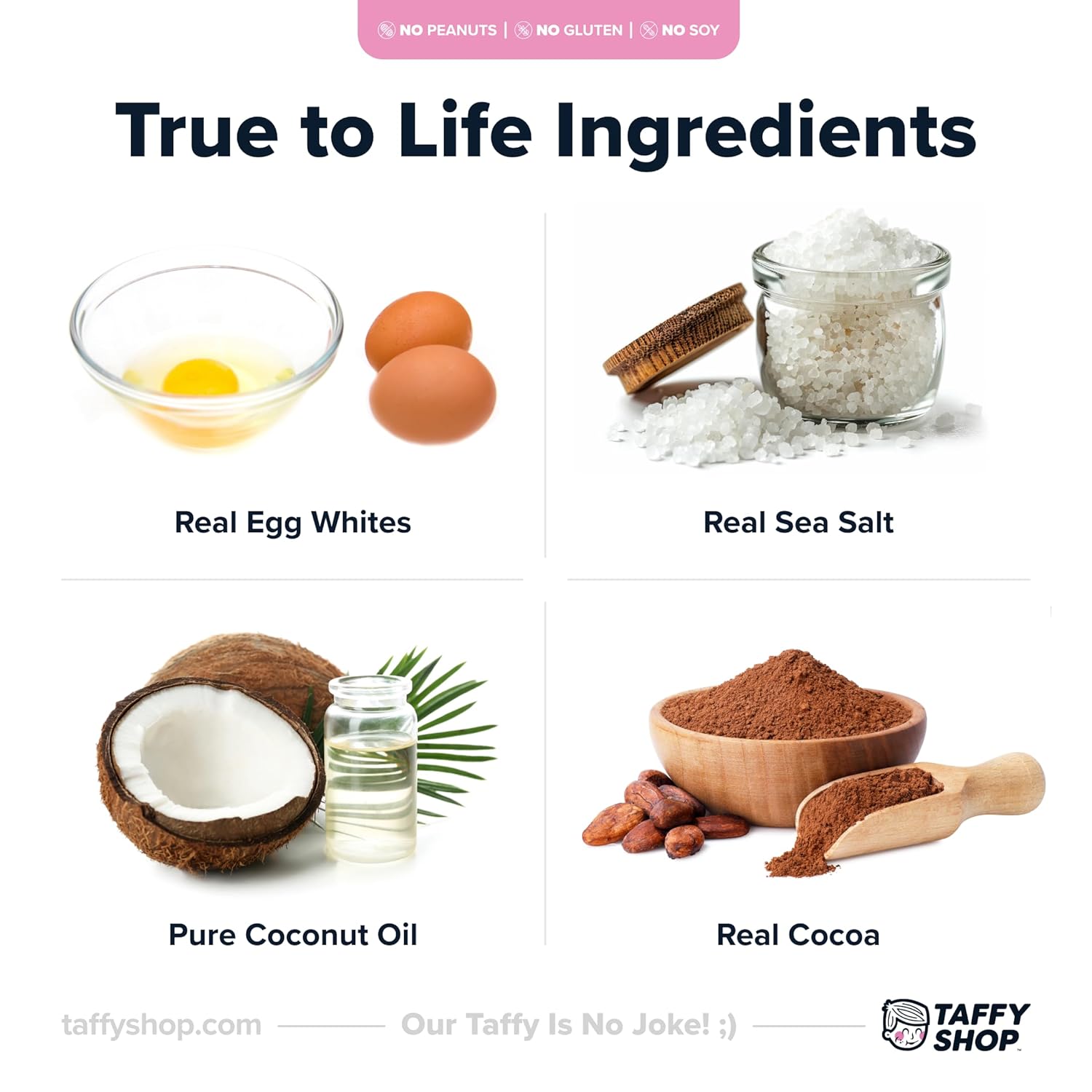 - Gourmet & Shameless: Our premium saltwater taffy is crafted from fresh protein rich egg whites, real sea salt, and coconut oil. A healthy snack made peanut free, soy free, and even sugar-free options for all to enjoy!