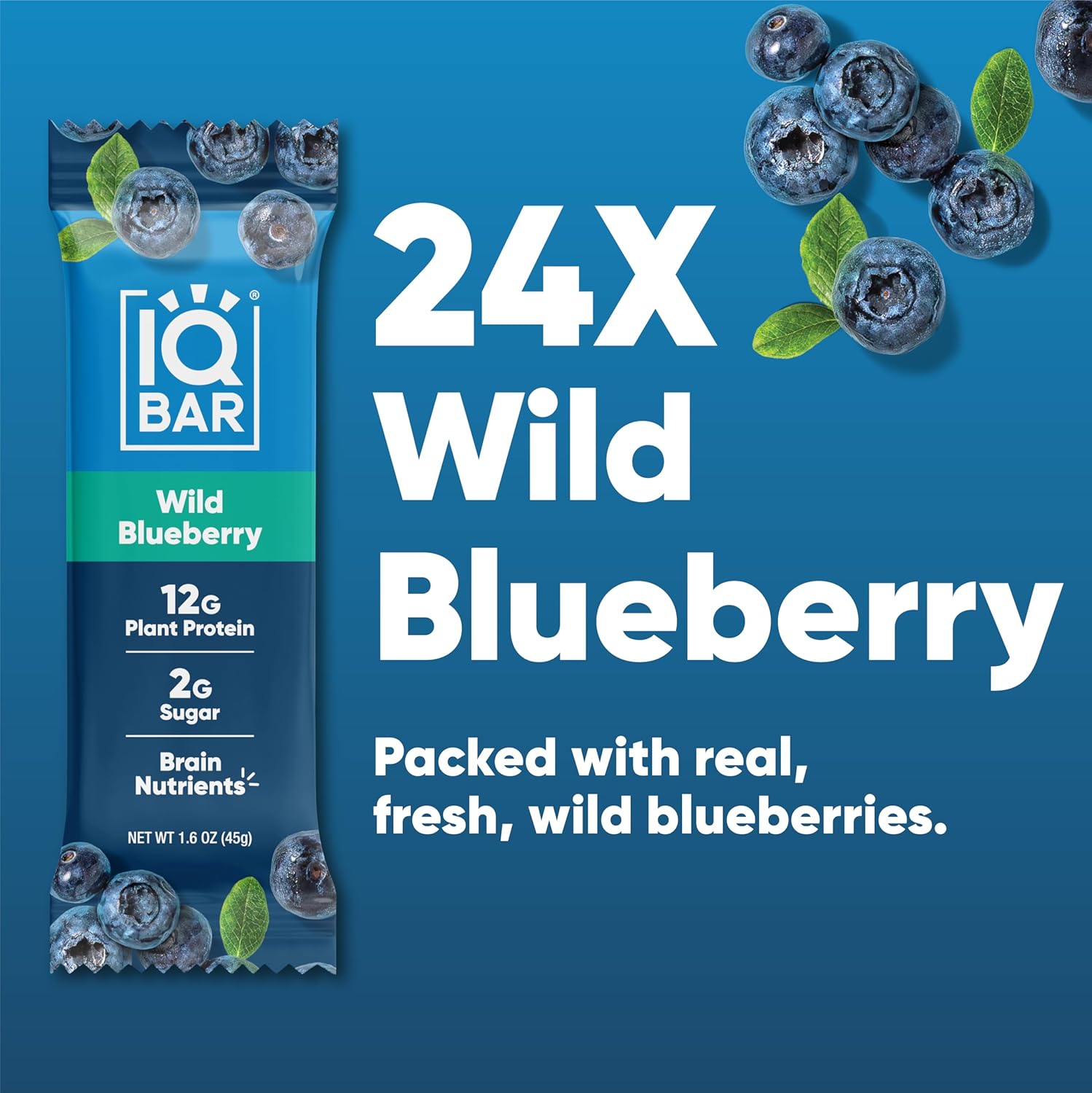 IQBAR Brain and Body Plant Protein Bars - Wild Blueberry - 24-Count Low Carb - Gluten Free, High Fiber, Vegan Snacks - Low Sugar Meal Replacement