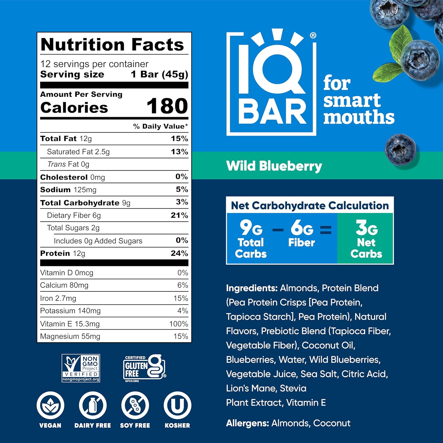 IQBAR Brain and Body Plant Protein Bars - Wild Blueberry - 36-Count Low Carb - Gluten Free, High Fiber, Vegan Snacks - Low Sugar Meal Replacement
