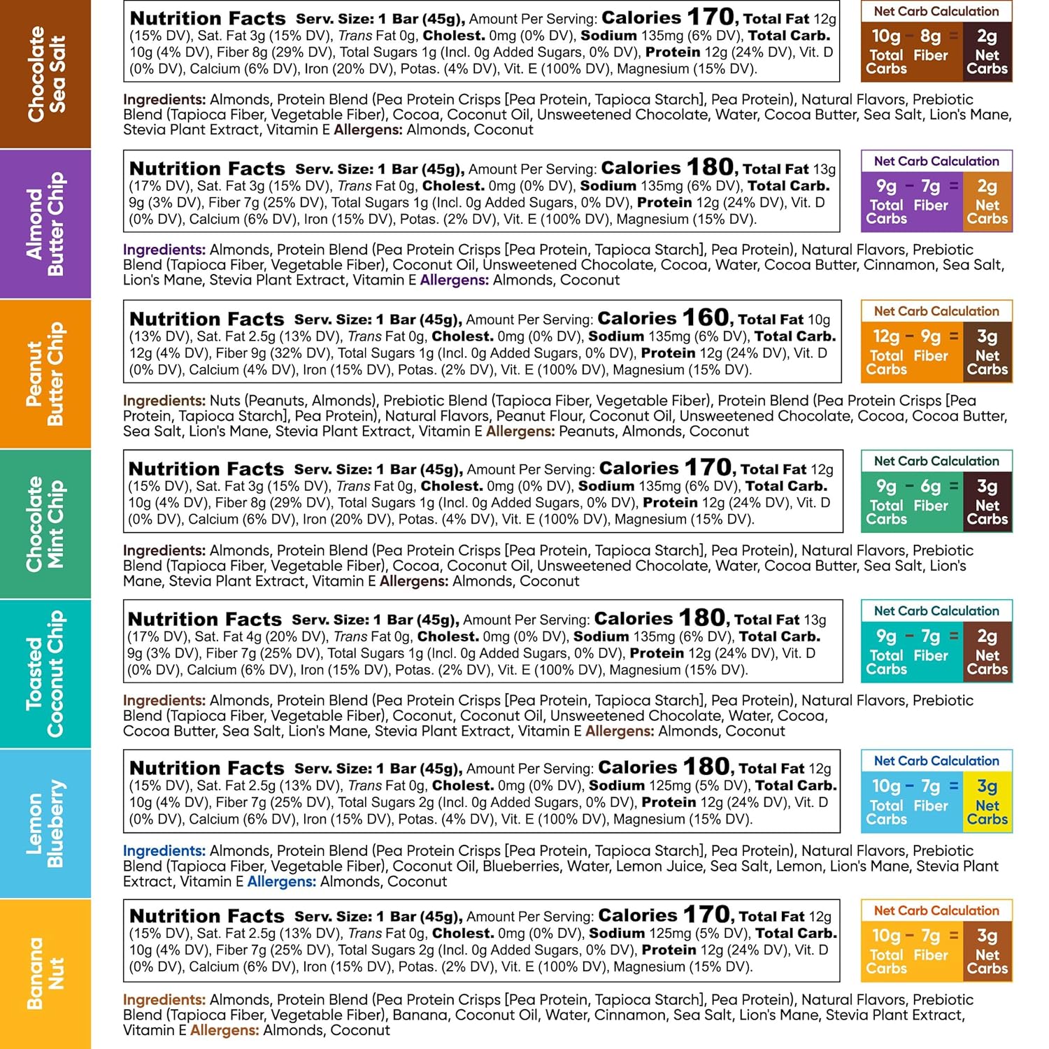 - KETO FRIENDLY SNACKS w/ Only 2-3g Net Carbs in Every Serving - Net carbs are carbs that are absorbed by the body, and our keto treats come with only 2-3g of net carbs in every serving. Each keto plant based protein bar is packed with 9-12g of total carbs, 6-9g of fiber, 10-13g of fats & 160-180 calories. Try our 7 flavors Chocolate Sea Salt, Peanut Butter Chip, Almond Butter Chip, Toasted Coconut Chip, Lemon Blueberry, Banana Nut, and Chocolate Mint Chip