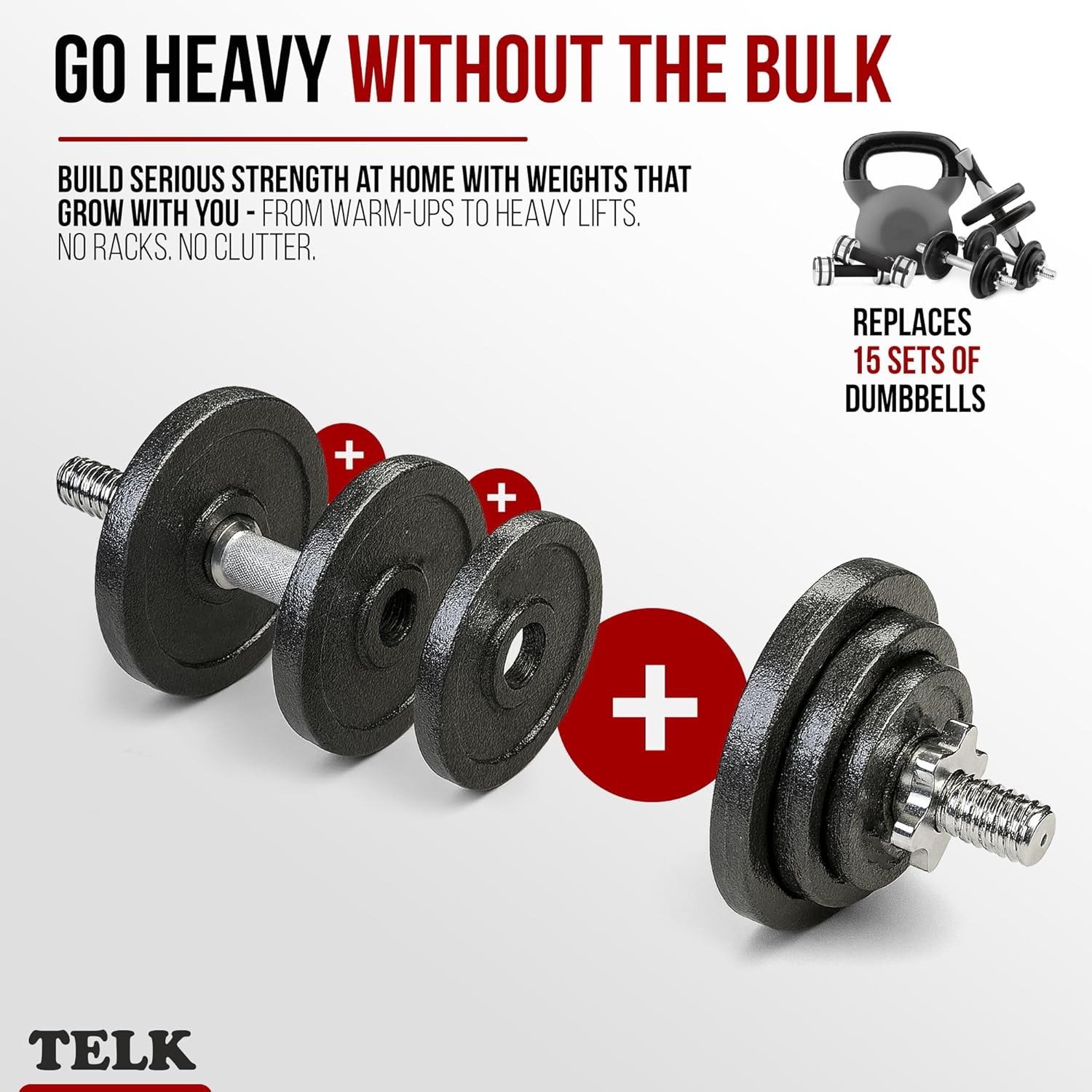 TELK – Adjustable Dumbbell Set – Home Gym Weight Set with Baked Enamel Cast Iron Plates – Space-Saving Free Weights for Strength Training