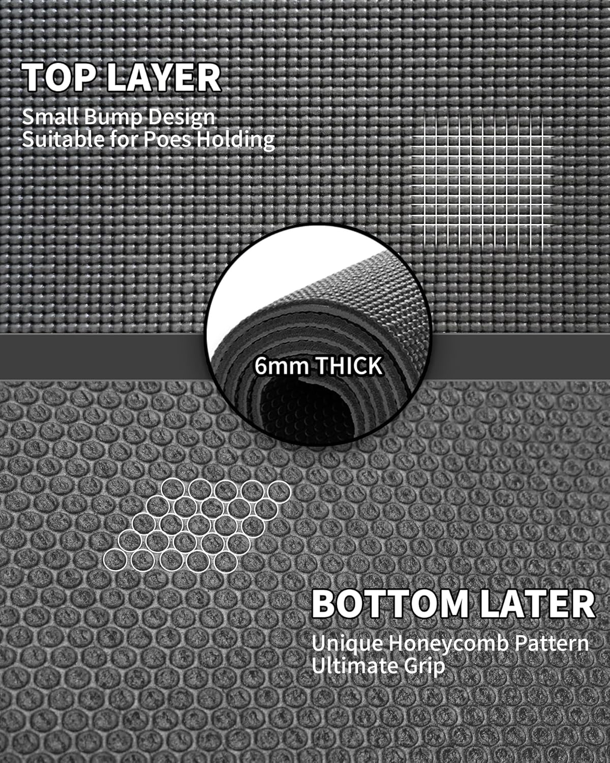 - UNIQUE HONEYCOMB BOTTOM DESIGN - The reverse protruding texture grips and prevents the mat from sliding around and offers stability on hard or soft surfaces. Your feet can easily grounded and secured on the mat when you go through the practice. Treat yourself to a unrestricted exercise experience on a reliable mat.