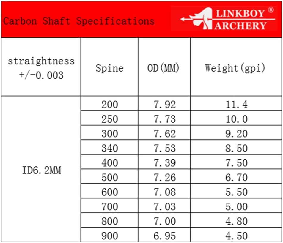 - Straightness: +/- .003",ID6.2mm,more spine for you choose.Shaft made from high quality pure carbon