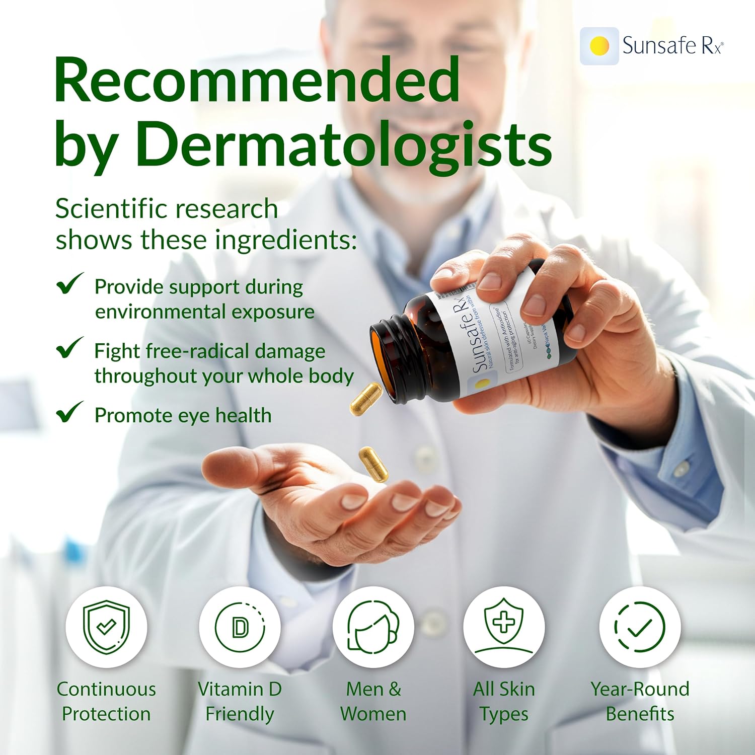 Sunsafe Rx Anti Aging Supplement: Natural Skin Protection Pills with Antioxidants for a Youthful Appearance & Eye Health + Vitamins, Minerals, & 250mg Polypodium Leucotomos (60 Capsules)