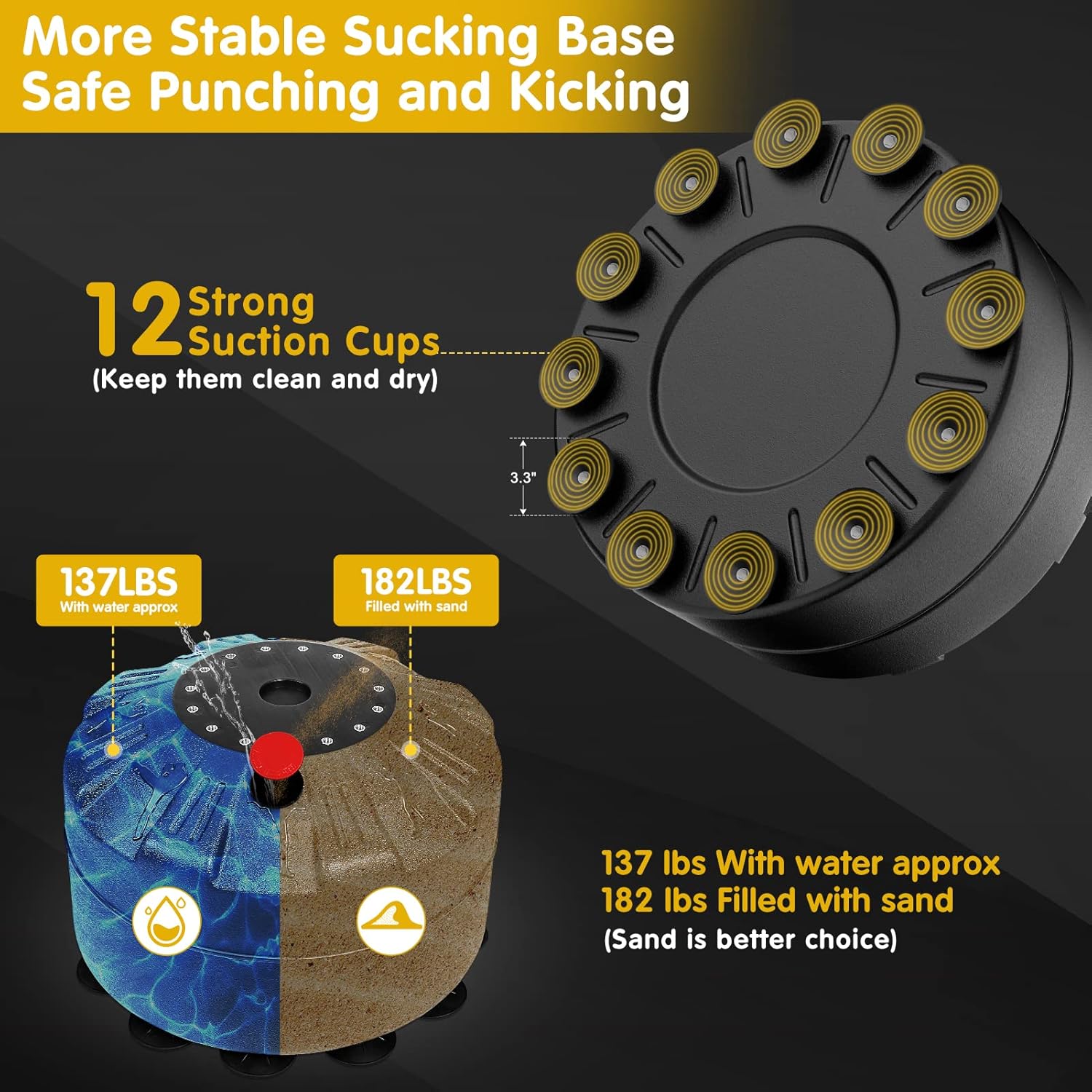 - [STABLE FLOOR SUCKING BASE] Rounded ABS tank base for easy rolling relocation. Includes 12 strong suction cups beneath to stop base movement. Filled with sand or water, sand proves more stable
