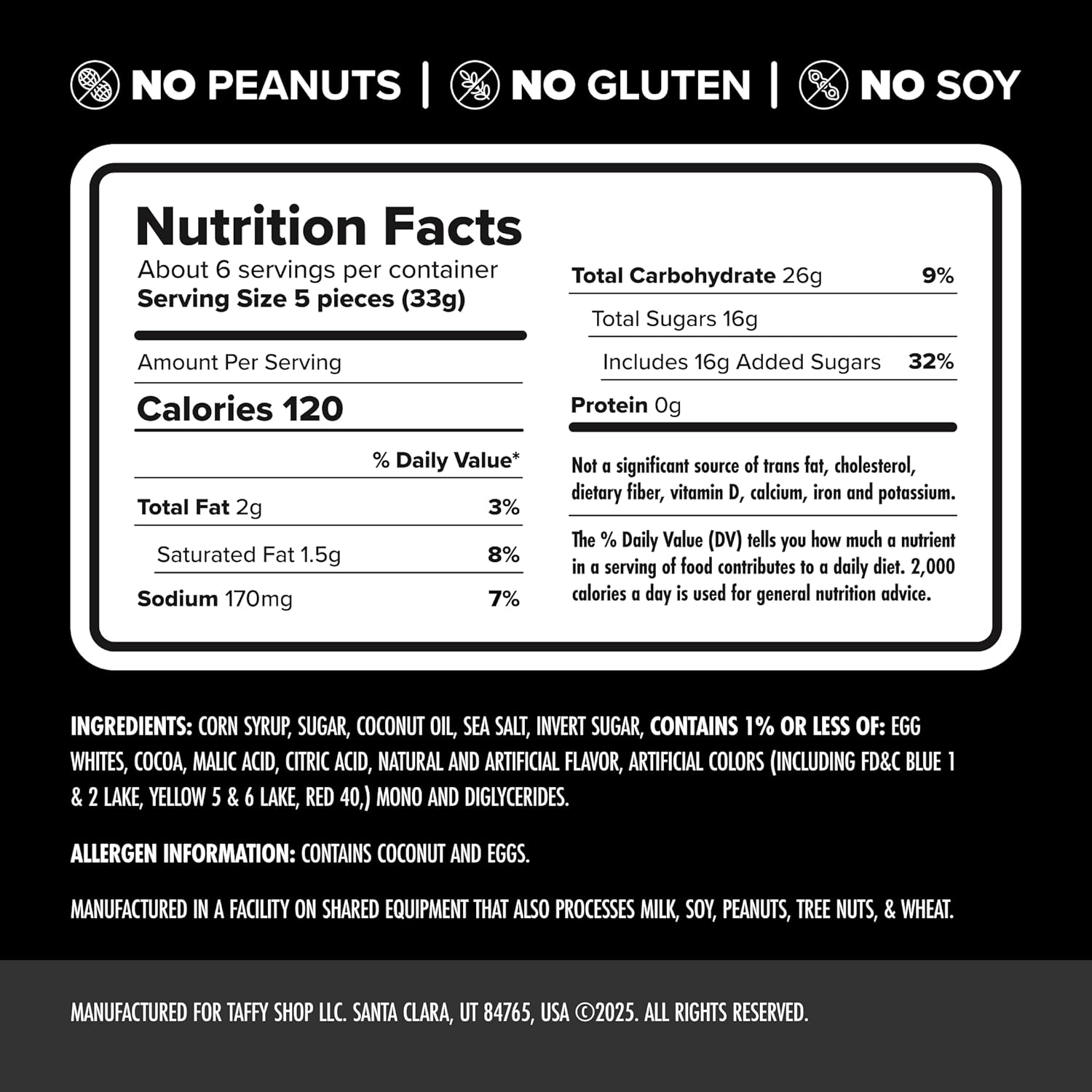 - Gourmet & Shameless: Our premium saltwater taffy is crafted from fresh protein rich egg whites, real sea salt, and coconut oil. A healthy snack made peanut free, soy free, and even sugar-free options for all to enjoy!