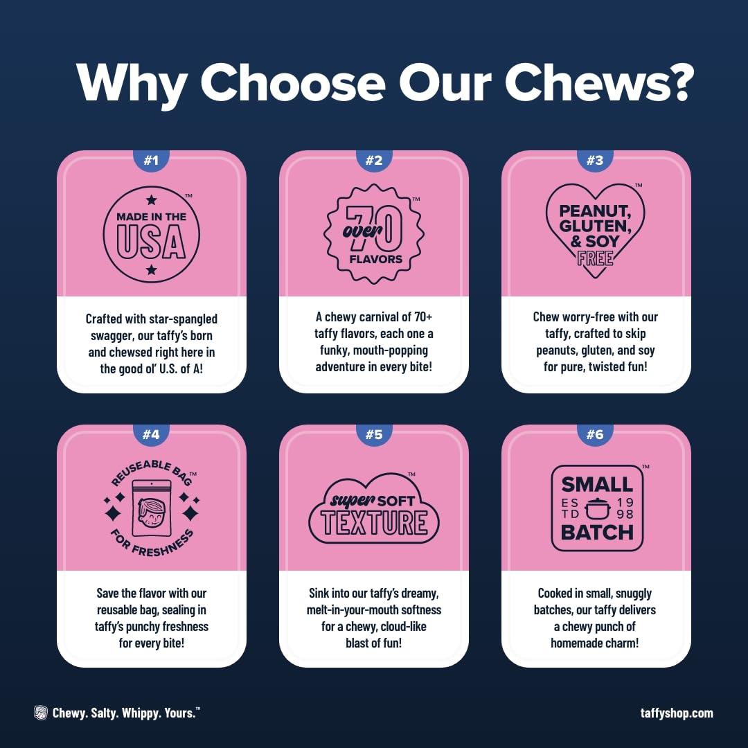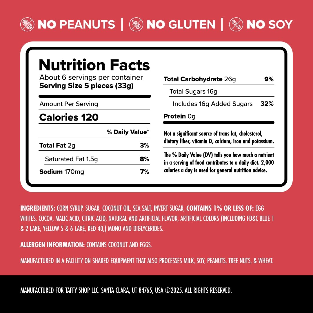 - Gourmet & Shameless: Our premium saltwater taffy is crafted from fresh protein rich egg whites, real sea salt, and coconut oil. A healthy snack made peanut free, soy free, and even sugar-free options for all to enjoy!