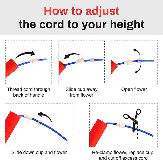 - FLOWER CUP ADJUSTMENT SYSTEM: Our speed jump rope comes with a unique flower cup adjustment system, that allows you to custom-size the rope cord for your height in seconds for anyone 6'7" or under.