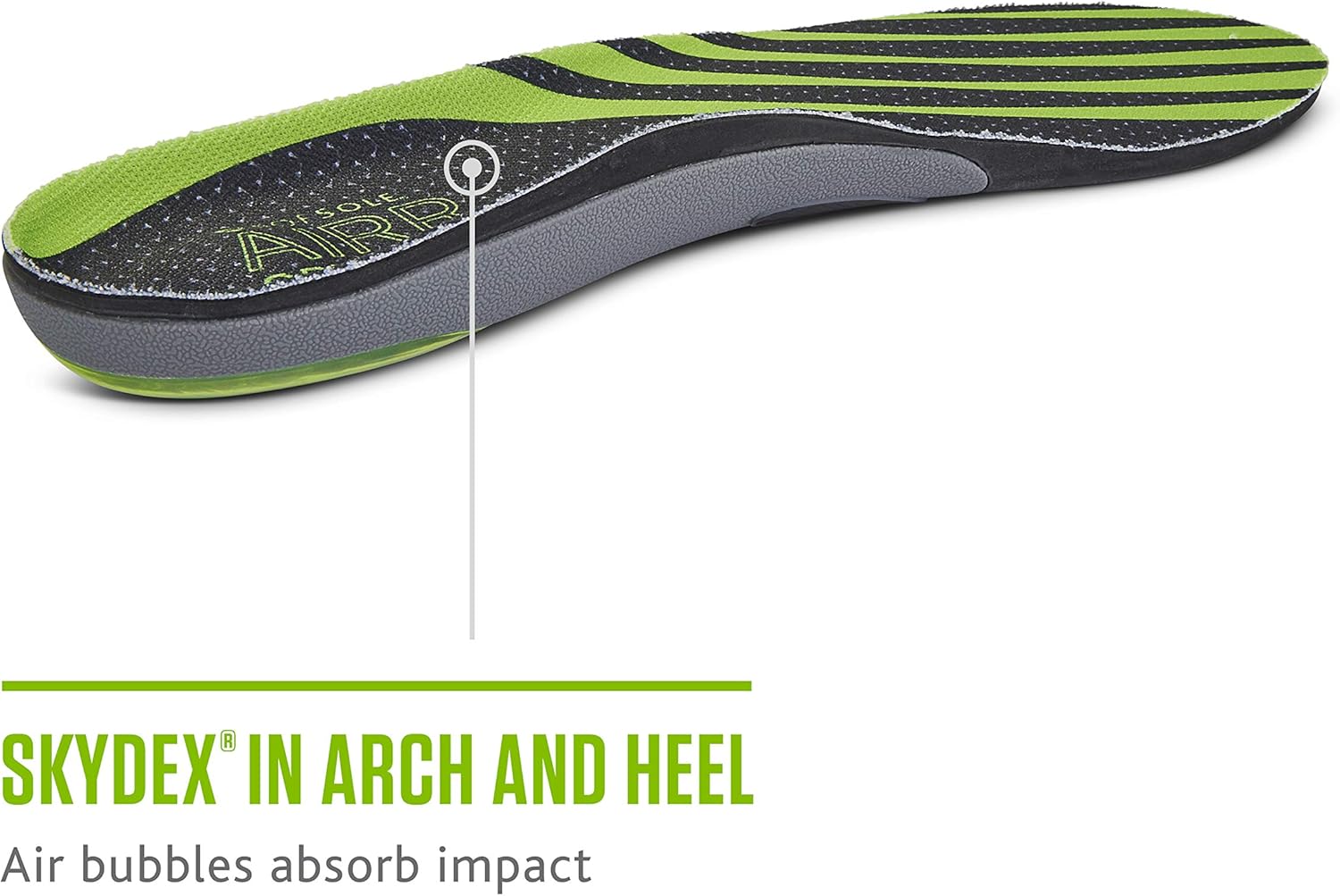 - SKYDEX air bubbles in the heel and arch of the insert absorb shock during high impact activities