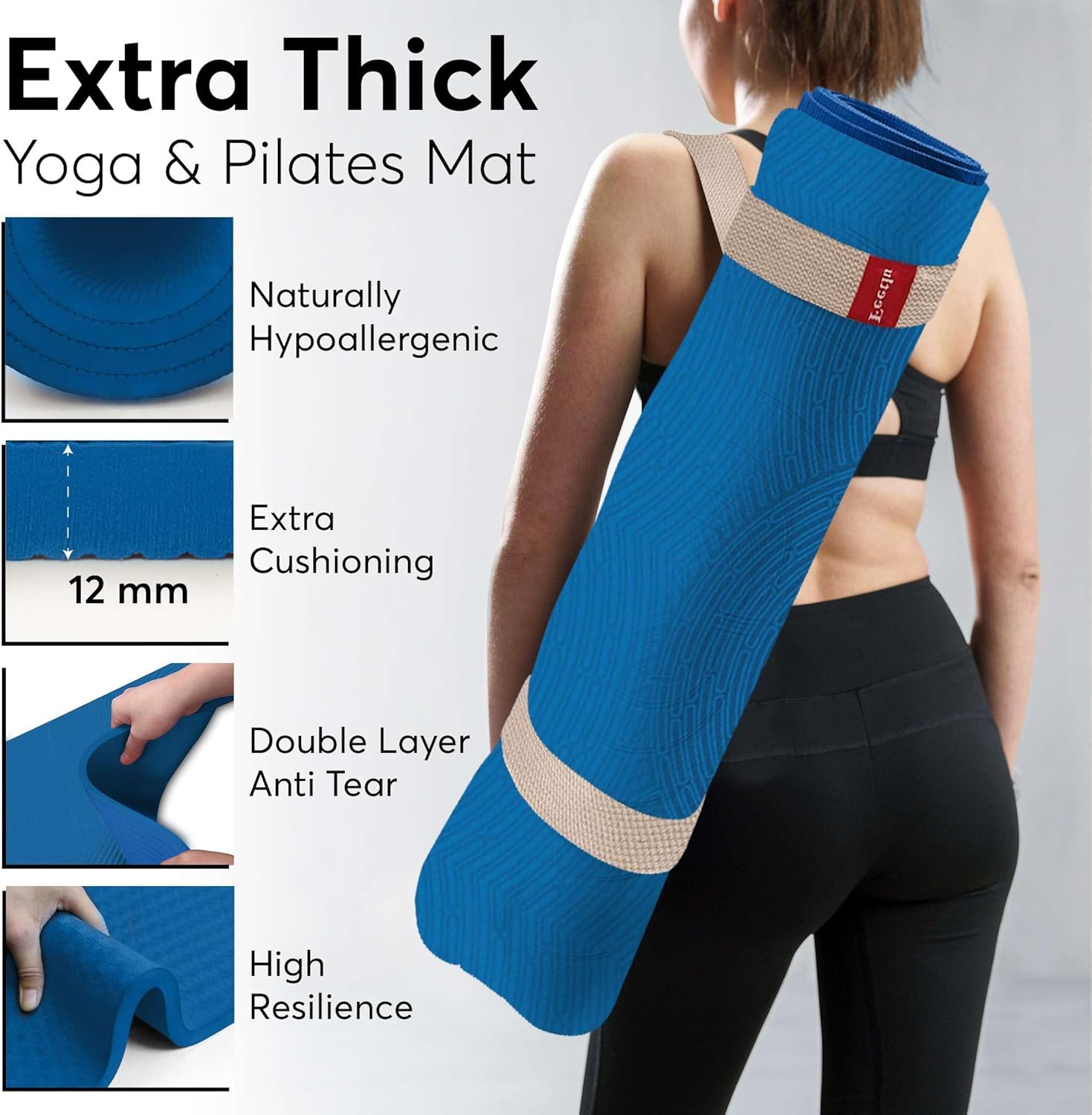 Extra Thick 12mm Exercise Mat – Non-Slip, Joint-Friendly & Cushioned Fitness Mat for Yoga, Pilates & Floor Workouts – Durable, Supportive & Includes Feetlu Classic Strap