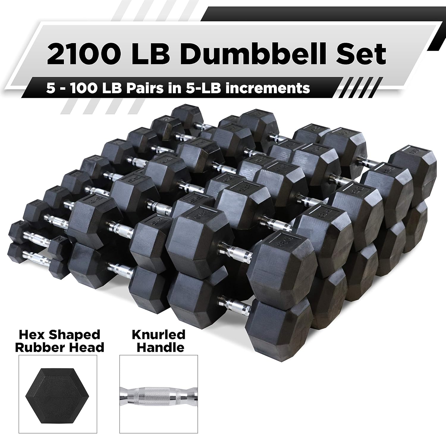 WF Athletic Supply Rubber Coated Hex Dumbbell Set, Multiple Choices Available - Dumbbells with Rack Stand and Mat, or Dumbbells Only (200/550/1200/2100/3000 LB)