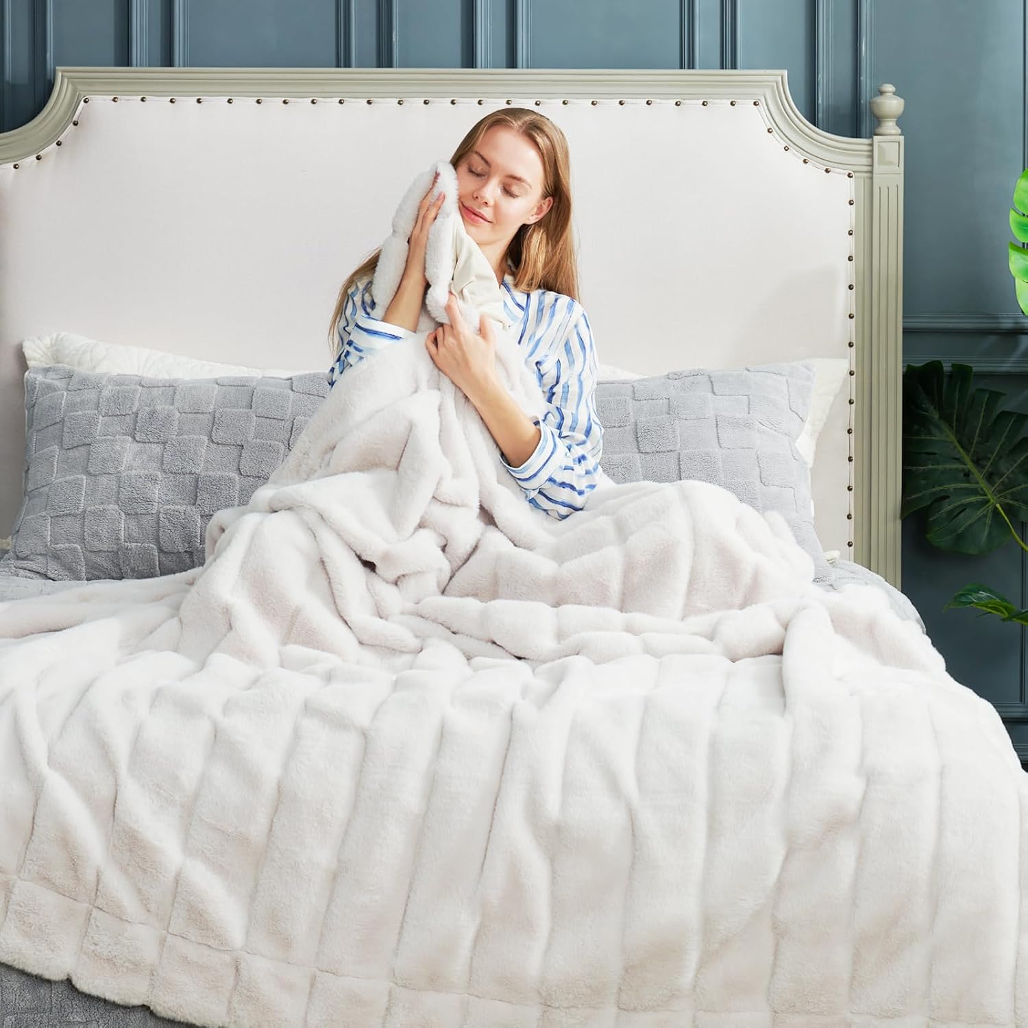 Cozy Bliss Faux Fur Throw Blanket for Couch, Cozy Soft Plush Thick Winter Blanket for Sofa Bedroom Living Room, 50 * 60 Inches Beige