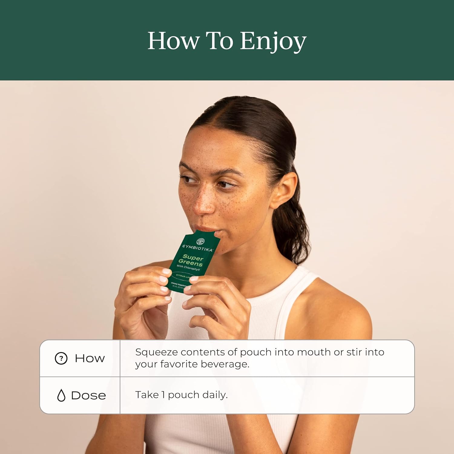 - HOW TO ENJOY: Squeeze the entire contents of the pouch directly in your mouth or stir into your favorite beverage. Store in a cool, dry place away from direct sunlight. Great for getting your greens in on the go.