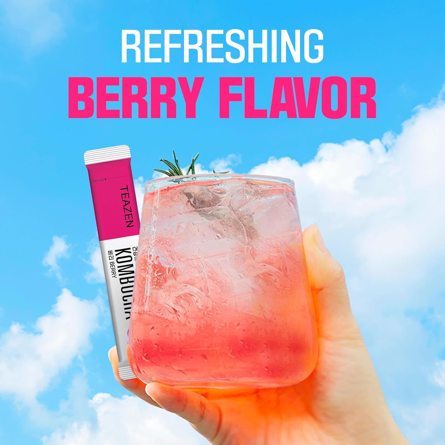 TEAZEN Berry Kombucha Tea, Hydration Drink Mix, Sugar Free, Live Probiotics & Prebiotics, 10 Sticks, 1.76oz