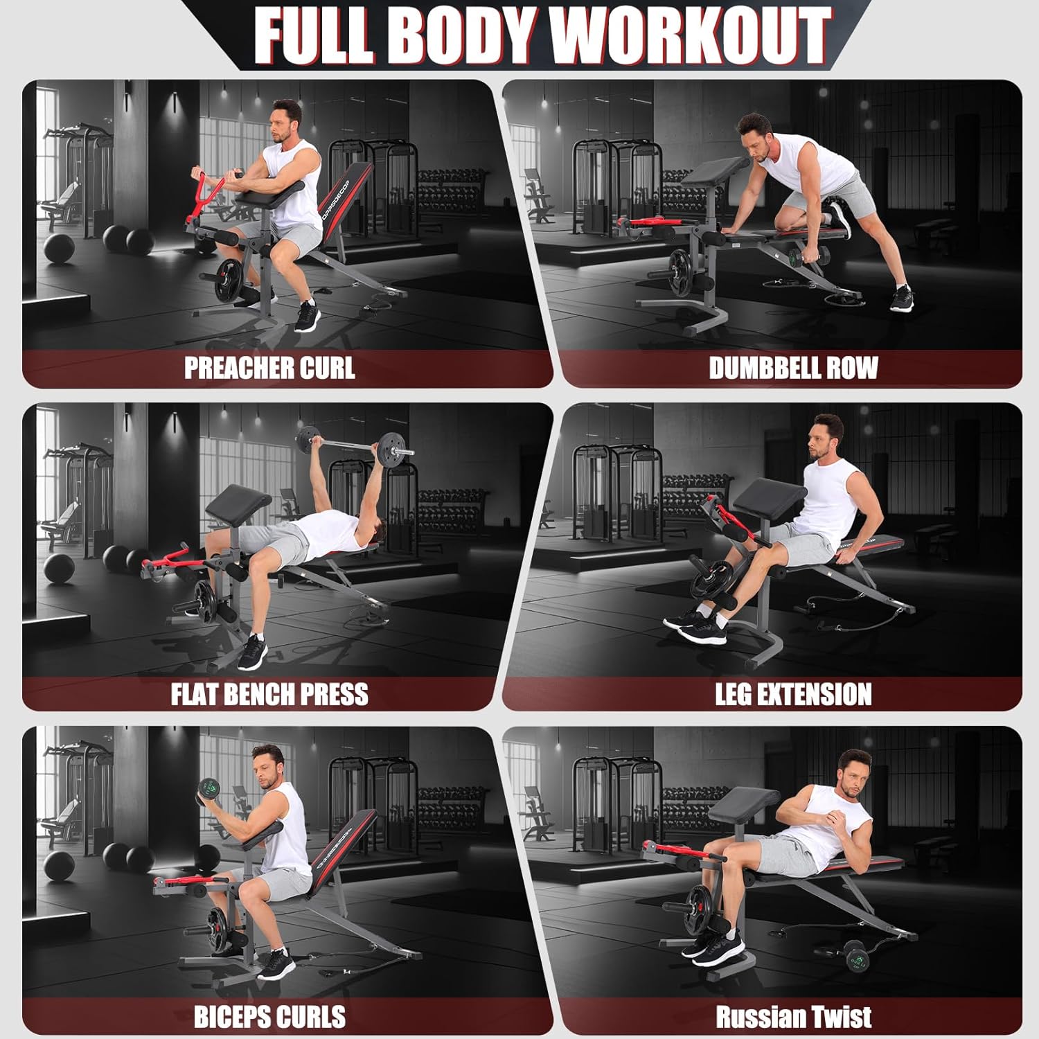 - 【Adjustable Weight Bench Set】This weight lifting bench has 7 adjustable backrest positions and 3 level preacher curl pad. That you can easily adjust to incline, flat and decline positions. Multi-function leg developer provide you more fun.
