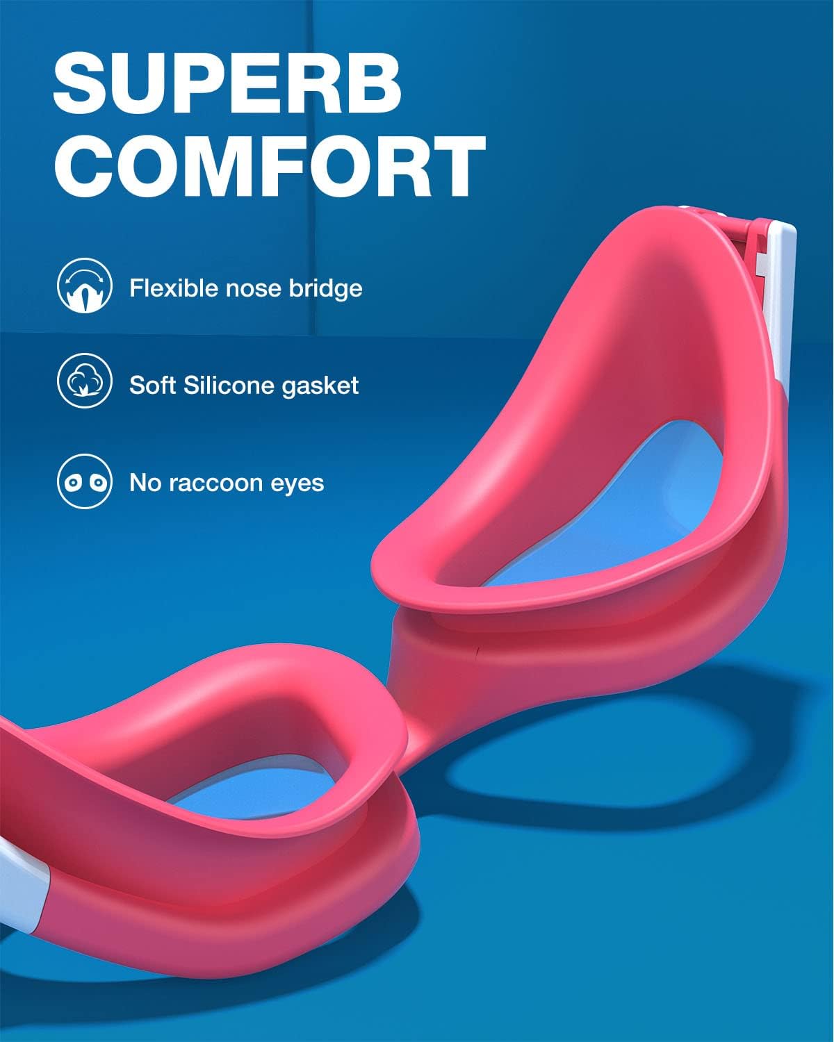 - [Comfortable Wearing] - This swimming goggles come with soft and flexible silicone gasket, adjustable split head strap, TPR ergonomic nose bridge, provides excellent suction and ensure non-slip coverage, that is designed to fit a wider range of face shapes for both women and men