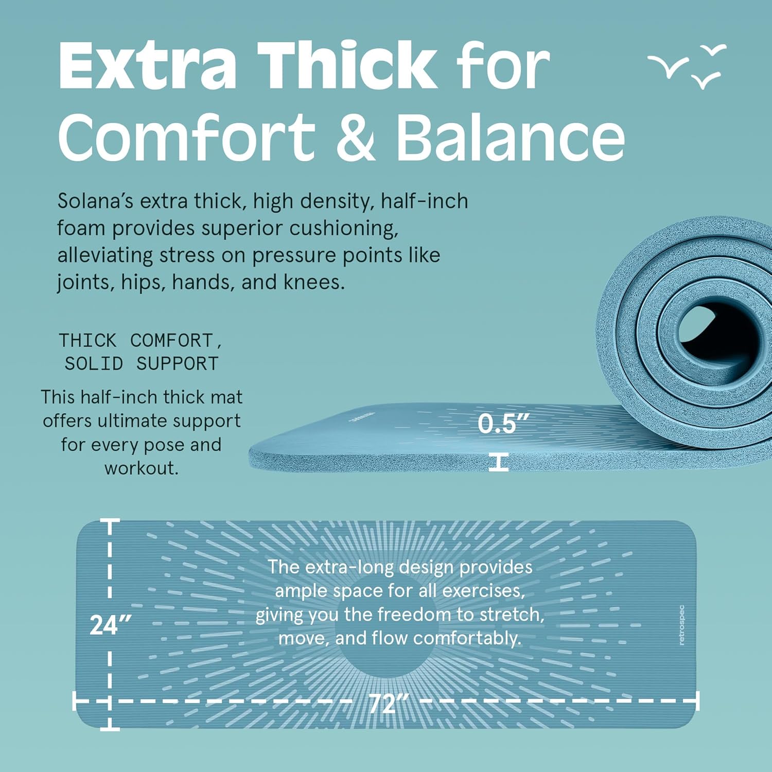 - Extra thick for comfort and balance: Solana firm Β½-inch extra thick fitness mat w/ mat strap alleviates stress on pressure points such as joints, hips, hands, and knees. 72" x 24" x Β½"