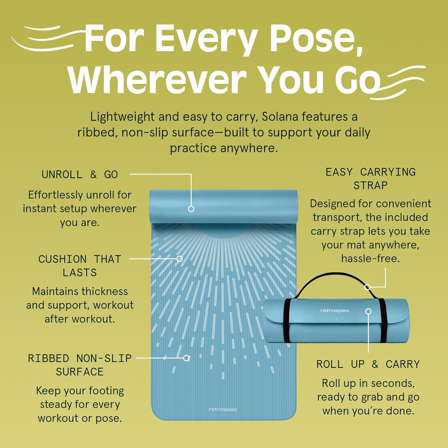 - Non-slip surface: Solana's non-slip material keeps you steady and balanced while staying securely on the floor, preventing injury and allowing you to focus on your practice or workout.