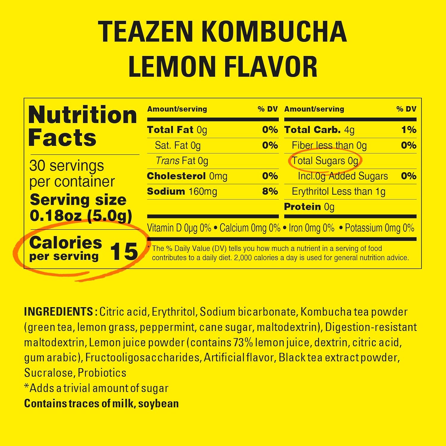TEAZEN Lemon Kombucha Tea, Hydration Drink Mix, Sugar Free, Live Probiotics & Prebiotics, 30 Sticks, 5.29oz