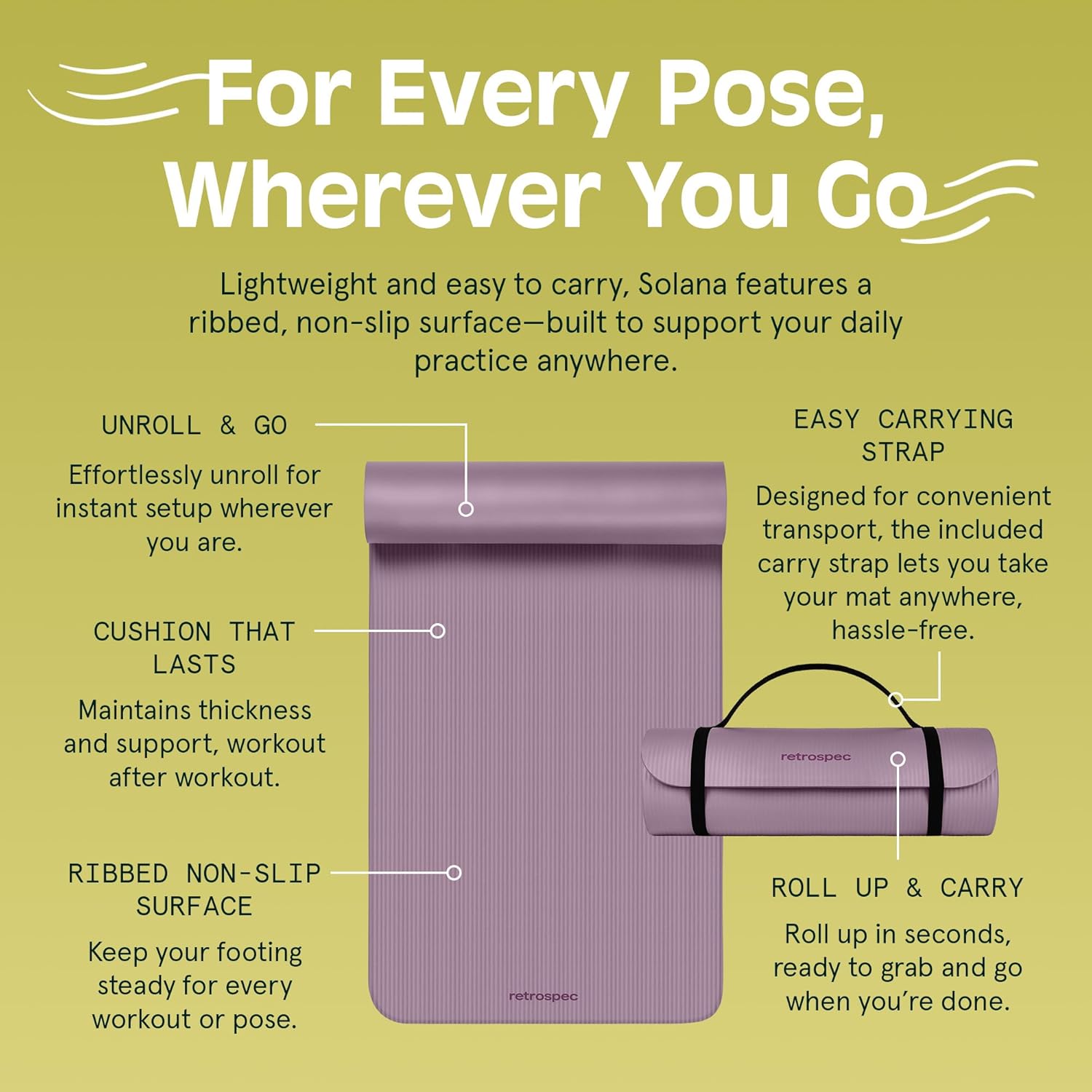 - DURABLE & PORTABLE: Solana's thick, durable material allows for everyday use, regardless of the intensity of your exercise. Solana comes equipped with a nylon carrying strap so you can easily transport it from your home practice to studio salutations.