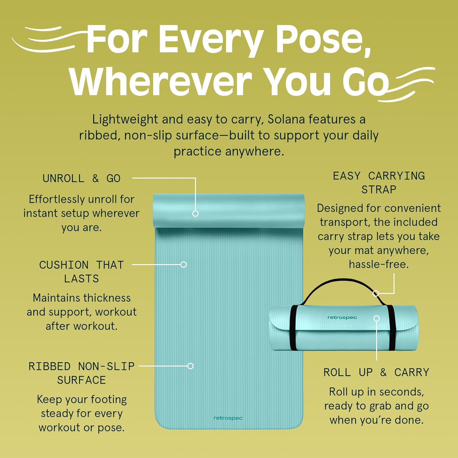 - DURABLE & PORTABLE: Solana's thick, durable material allows for everyday use, regardless of the intensity of your exercise. Solana comes equipped with a nylon carrying strap so you can easily transport it from your home practice to studio salutations.