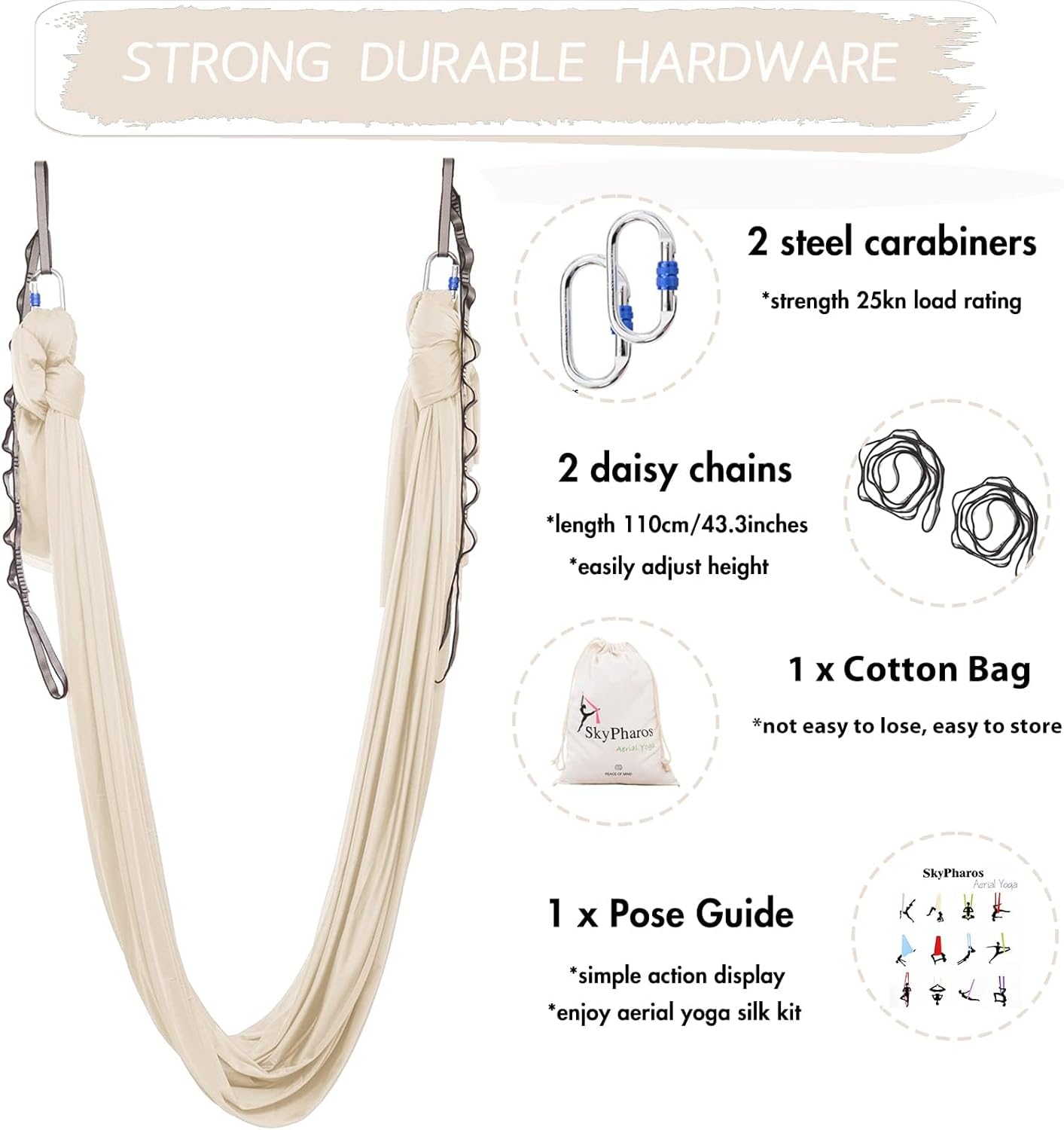 - HEAVY-DUTY HARDWARE - The flying yoga hammock includes ALL THE HEAVY-DUTY hardware required to safely install it yourself. You will get 5.5 yards aerial silk, 2 x daisy chains๏ผ2 x Steel Carabiners, 1 x Pose Guide, 1 x carry bag. They are strength and safety certified with high weight-load capacities.