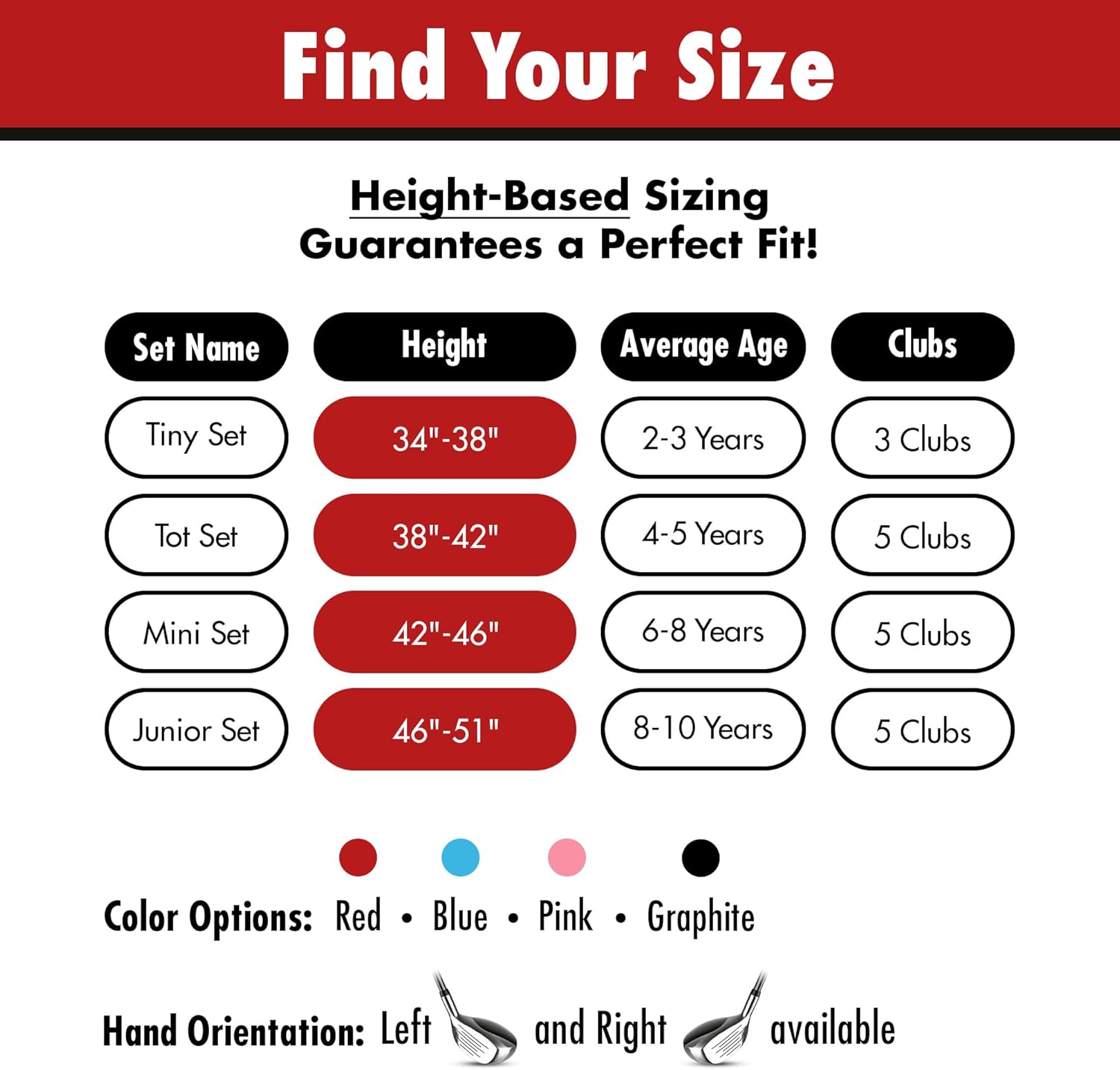 - DESIGNED FOR KIDS’ HEIGHTS AND STRENGTHS: Specifically sized golf clubs for kids ages 4 - 5 years and 38" - 42" tall to promote proper swing mechanics, maximum forgiveness, and optimal launch angles for an enjoyable golfing experience.
