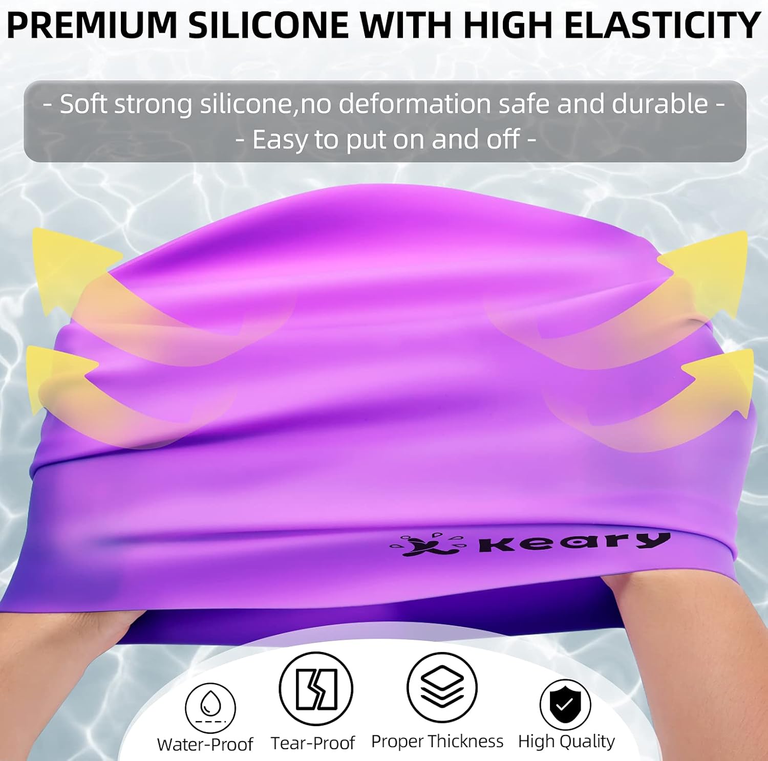 - 🏊【DRY HAIR IS THE GOAL】Proper use of Keary large swim caps for long hair can keep your hair dry. You can adjust the tightness by squeezing air out of the swimmers cap and getting a perfect seal. Protect your hair and ears from dirt / chloride and other substances in the water, these swim caps insure a safe and happy swimming experience.