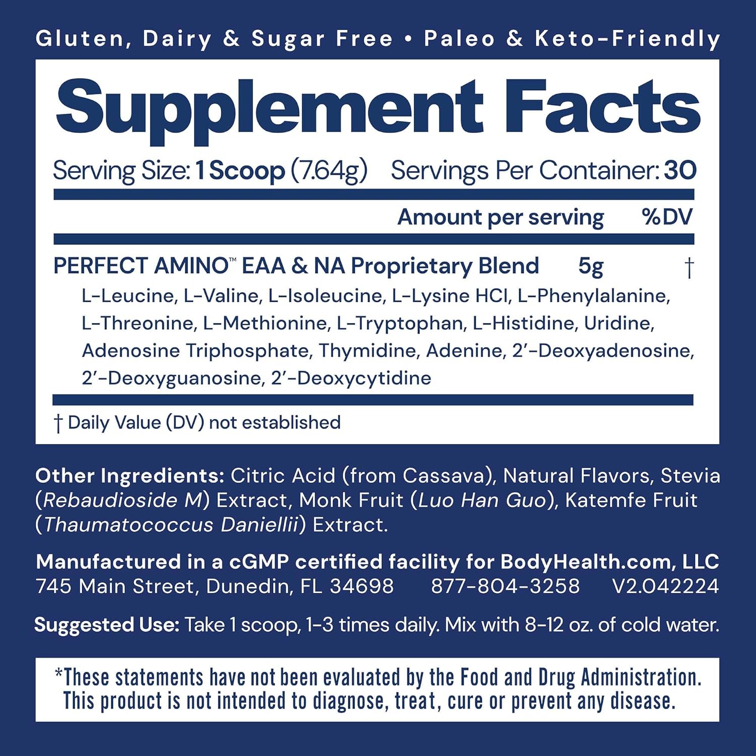 - WILL NOT BREAK A FAST. BCAAs amino acids are free from sugars, yeast, gluten, soy, corn, wheat, rice, and preservatives. Perfect Aminos is vegan sourced, keto, and produced in cGMP Certified facilities in the USA for assured quality and safety.