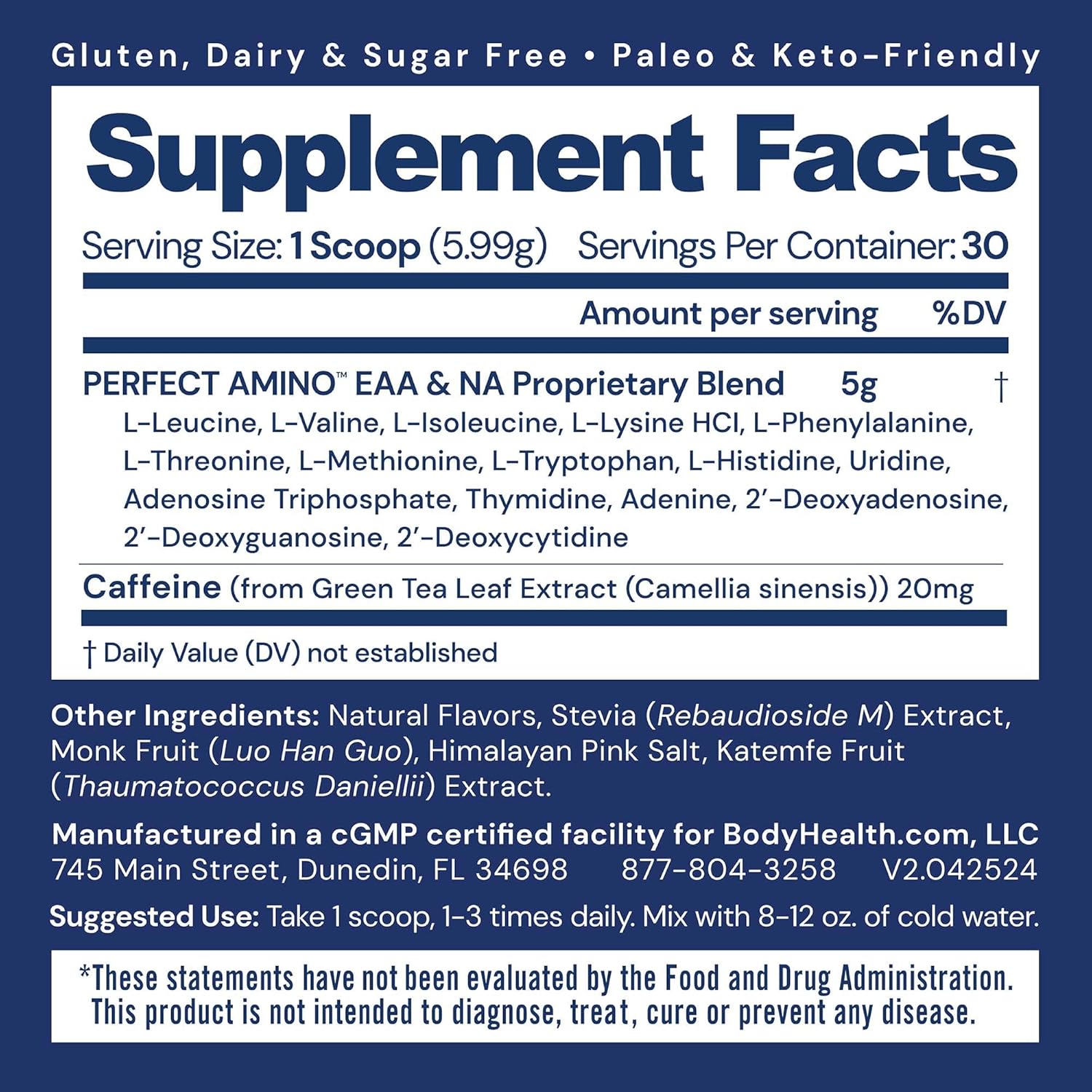 BodyHealth PerfectAmino Powder - BCAA and EAA Powder for Pre and Post Workout - Amino Acid Energy Drink for Men and Women to Support Lean Muscle and Recovery - Mocha - 30 Servings