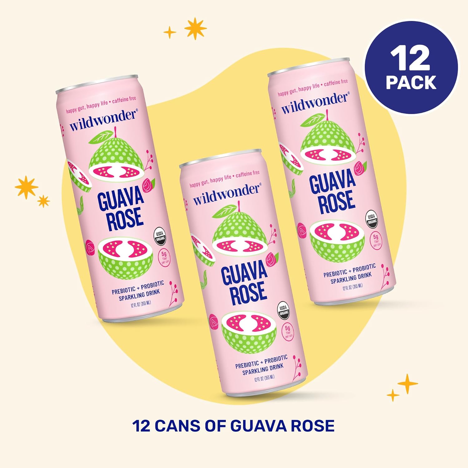 wildwonder Sparkling Probiotic Drink 12pk, For Gut Health & Immune Support, Guava Rose, 5g Prebiotic Fiber, Live Probiotics, Organic, Vegan, Low Sugar, 12 Pack, 12oz Can, As Seen on Shark Tank