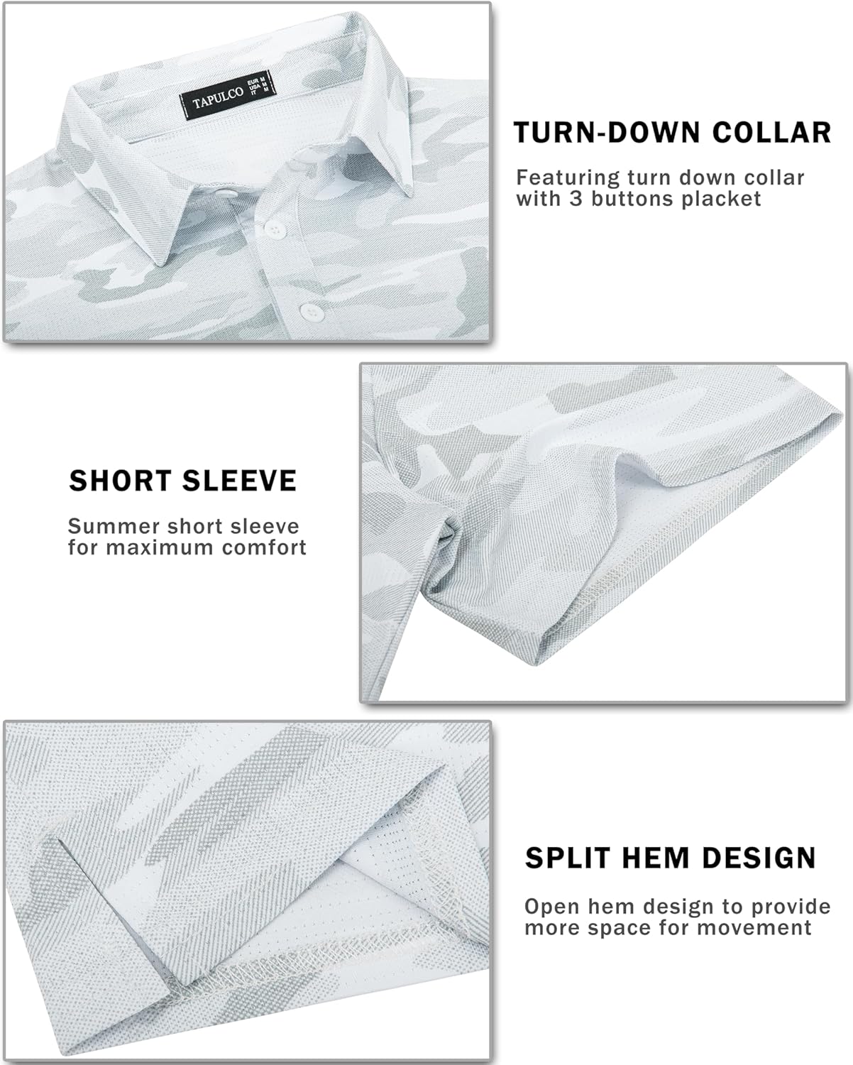 • IN STYLE: Stylish Camouflage Pattern/ Golf Polo Shirts with Adjustable Button Neckline/ Flat Knit Collar/ 3 Buttons Placket/ Casual Business Polos Style/ Short Sleeve Collared Shirts/ Stretchy Cuffs/ Modern Cut/ Not Easy to Wrinkle with Strong Toughness/ Basic Decent Shirt/ 3 Button Sport Polo Shirt/ Mens Essential Tops