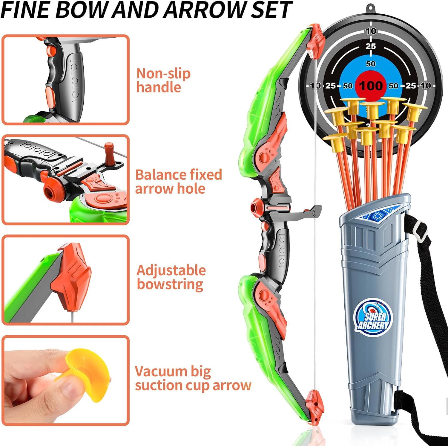 Bow and Arrow Set for Kids - LED Light Up Archery Toy Set - Includes 10 Suction Cup Arrows, Target & Quiver, Indoor & Outdoor Kids Archery Boys Toys