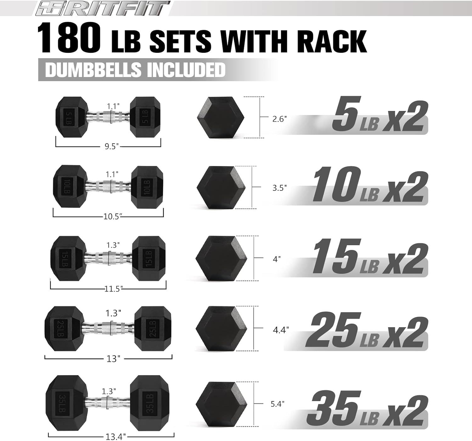 - Sets Included: This package contains a pair of 5LB, 10LB, 15LB, 25LB, 35LB, Dumbbells with 1 X 5-Tier Rack. Designed to store most sizes of dumbbells, the RITFIT Dumbbell Rack is ideal for your home gym setup to keep your training space organized.