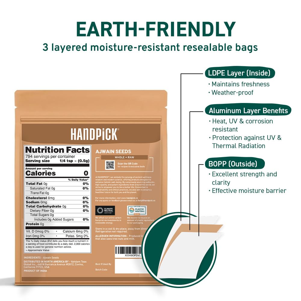 HANDPICK Ajwain Seeds (397g/14oz) Whole Carom Seeds | Vegan, Gluten free, Non GMO | Raw Carom Bishops, Indian Origin | Packed in Resealable Ziplock Pouch