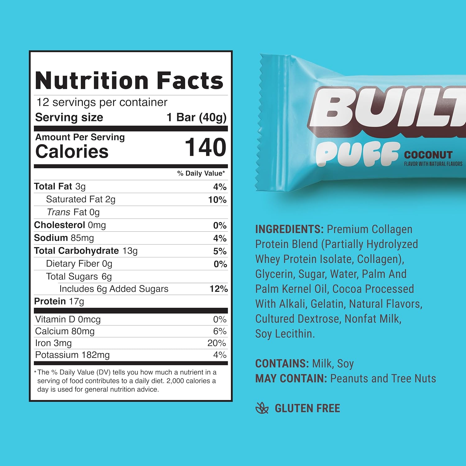 Built Bar, Puff Protein Bars, Coconut Puff, 17g Protein Snacks, On-The-Go Bars, Only 140 Calories, 6g Sugar, Collagen, Gluten Free, 12 Count