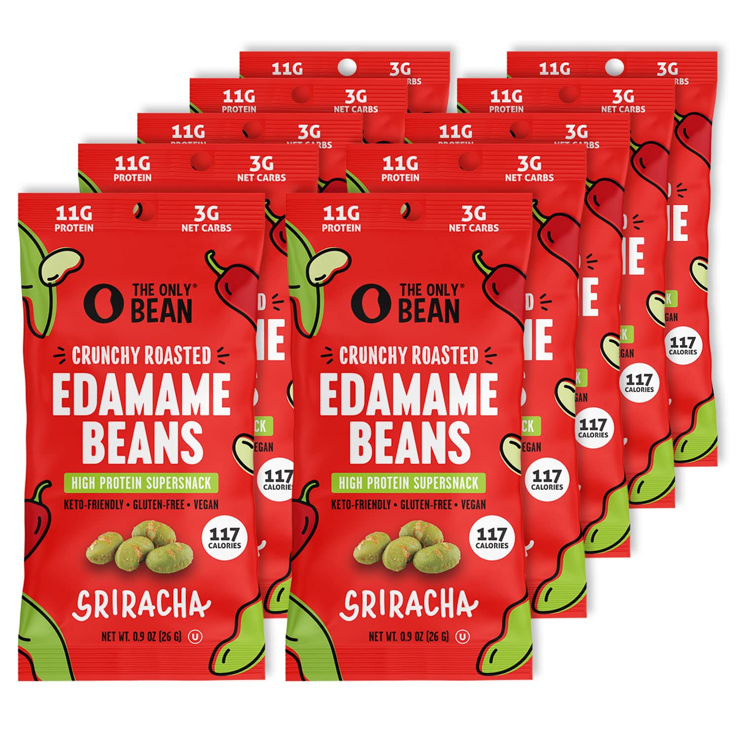 The Only Bean Crunchy Roasted Edamame Snacks Pack (Sriracha), Protein Keto Food, Gluten Free, Asian Japanese Snacks, Hot Spicy Snack, 0.9oz 10 Pack