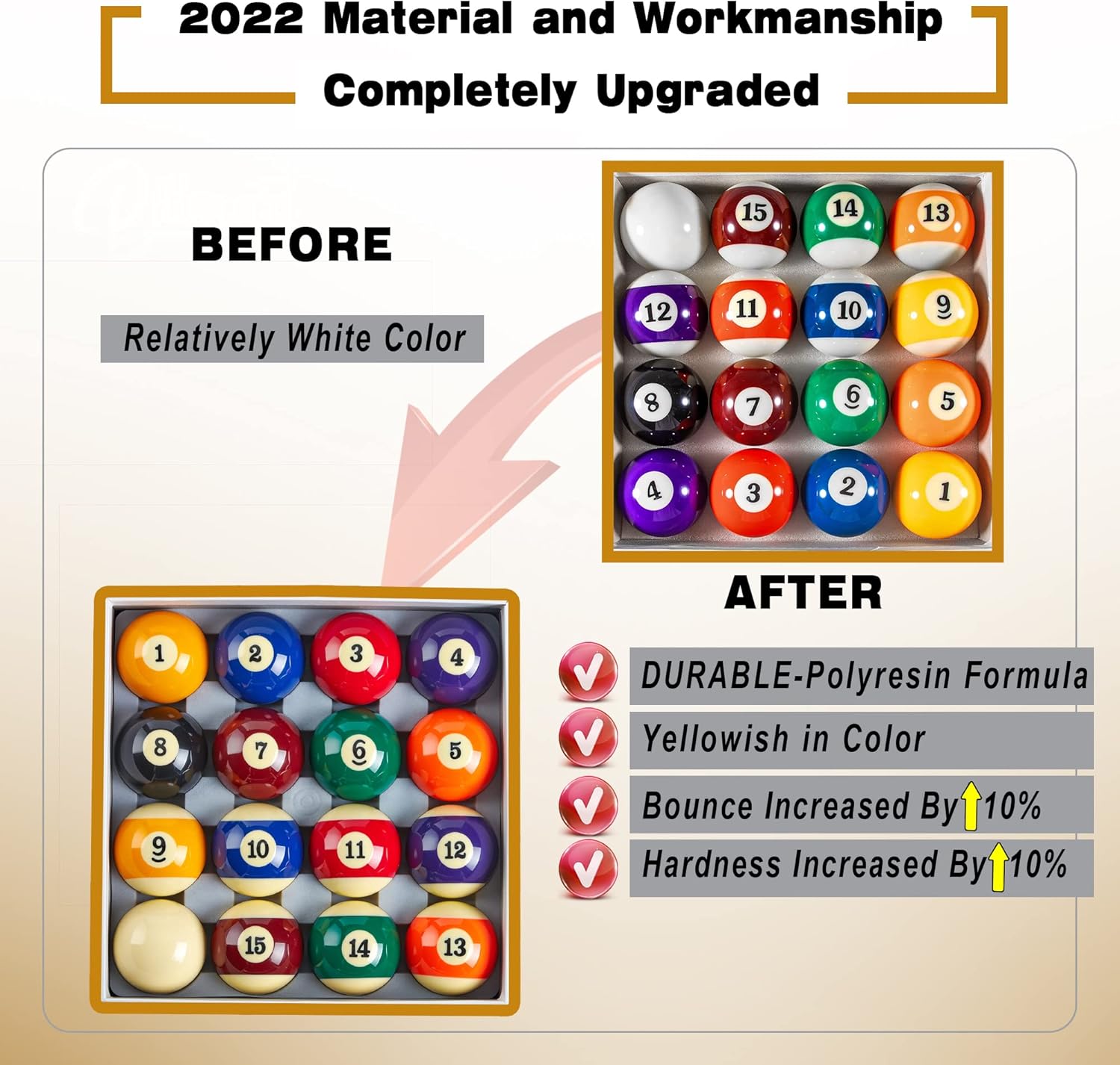 - 【2022 New Upgraded】: 2022 Billmart Pool Table Balls are completely upgraded from Material and Workmanship, crafted from high quality grade DURABLE-polyresin formula, Yellowish in color, Bounce and Hardness increased by 10%, more durable.