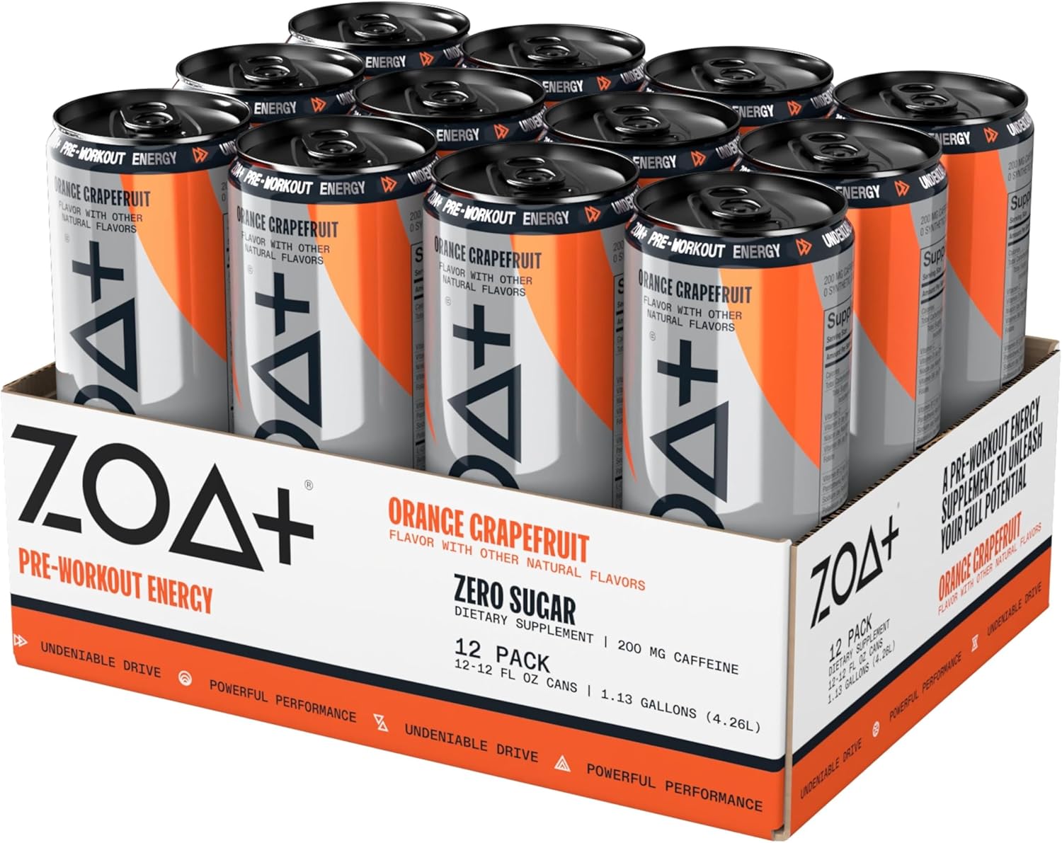 ZOA+ Pre-Workout Energy Drink Supplement - NSF Certified for Sport with Zero Sugar, Nitric Oxide Support, B & D Vitamins, Amino Acids, and Electrolytes (Orange Grapefruit)