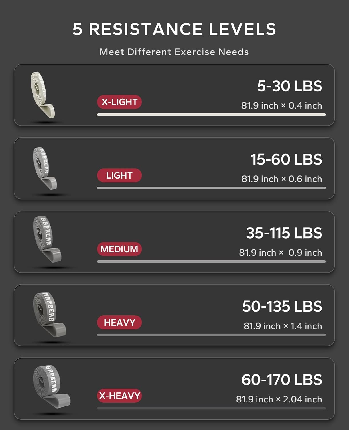 - 【5 Pcs with Varying Resistance Levels】Our pull up assistance bands comes with 5 resistance levels, which increase in layers, and you can switch combinations freely. X-LIGHT: 5-30 LBS, LIGHT: 15-60 LBS, MEDIUM: 35-110 LBS, HEAVY: 50-135 LBS, X-HEAVY: 60-170 LBS. The avant-garde and fashionable gray gradient colors will bring you a completely different experience in vision and use.