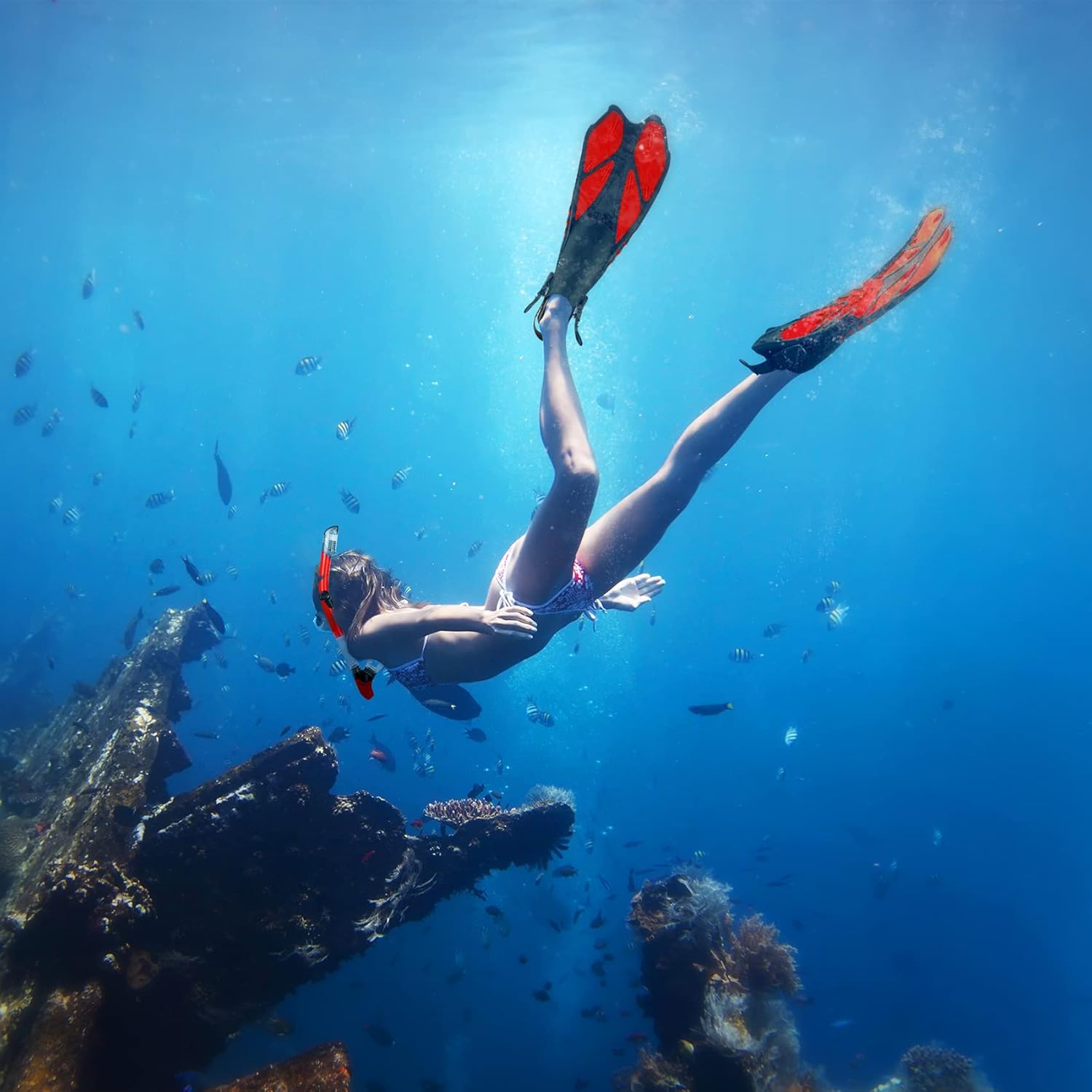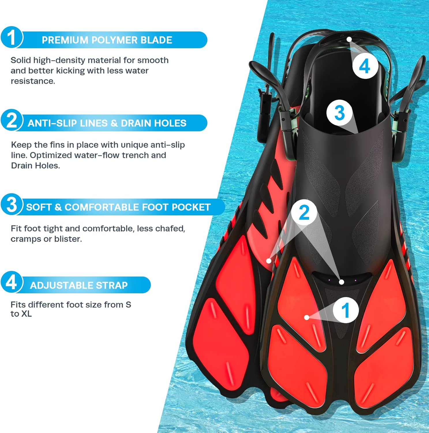 - Full mask fin snorkel set: zeeporte long snorkel set with adjustable fins, two window tempered glass lens mask, dry top silicone snorkel, travel gear bag, it's the ultimate travel companion and is suitable for snorkeling, swimming, body surfing, boogie boards and much more.