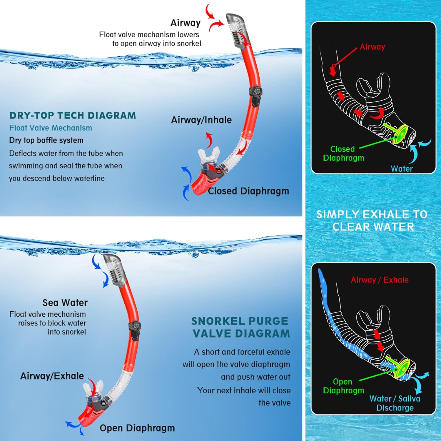 - Unobstructed breathing dry top snorkel: a high-quality snorkel with a dry-top valve that seals the breathing tube when submerged. dry top snorkel is designed to keep water from entering the breathing tube, ergonomic silicone mouthpiece is comfortable and durable. Lower purge valve allows water to be quickly expelled, so you can enjoy easy and unobstructed breathing while diving underwater.