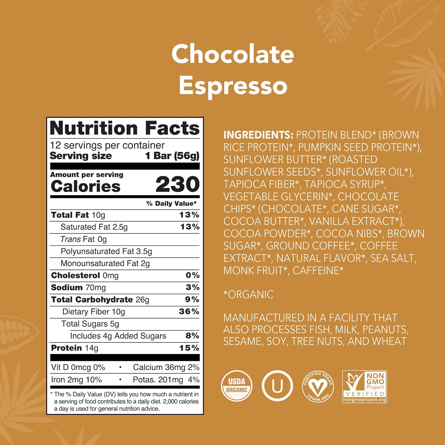 - Box contains 12 - 1.98 ounce USDA Organic Chocolate Espresso Plant Based Protein Bars