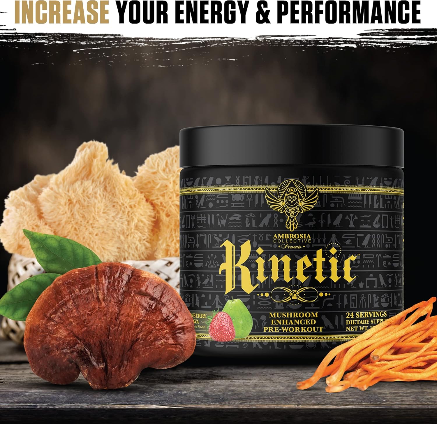 - MUSHROOM POWERED PRE-WORKOUT. With the power of earth pushing Kinetic energy to every muscle, you’ll lift mountains with Ambrosia’s Pre-Workout formula. Release sustainable power that outdated pre-workouts can’t compete with. With a highly specialized blend of mushrooms approved by the elders, Kinetic pre-workout is the first of its kind with the ability to single handedly change the quality of every workout.